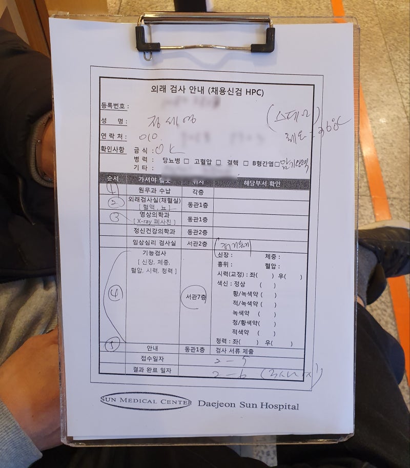 <在大田太阳医院接受西班牙工作假期健康检查> 비자 신청일로부터 1개월 이내 건강검진 대전이 서울과 가까워서 대전시 목동 선병원에서 건강검진을 받았습니다. 필수는 아니지만 확인 가능한 의료진이 있는지 일주일 전에 전화로 안내를 받았고, 병원에 들어간 후 동관 1층 서비스데스크에 가보니 이렇게 말했다고 한다. 스페인 비자를 위한 신체검사를 받으러 왔다고. 여권 번호와 주소를 영어로 알고 있어야 합니다. / 금식하셔야 합니다(6시간 금식) / 12만원 기억하세요 결과는 3일내로 나옵니다 / 결과는 SMS로 알려드립니다 / 등기우편으로 받아보실 수 있습니다. 검사 내용은 일반신체검사, 혈액검사, 소변검사, 흉부X선검사, 청력, 시력, 신체검사와 거의 100% 동일하게 하겠습니다. 시행한 검사에 비해 가격이 사악하지만 다른 병원도 하는 것 같다. 스페인 워킹홀리데이를 잘 준비하시길 바랍니다. 이 기사가 매우 도움이 됩니다!